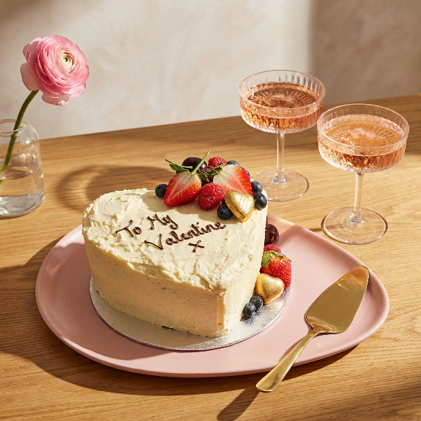 A beautifully finished and simple heart shaped cake. With a delicious vanilla Italian meringue buttercream outside and decorated with fresh seasona... read full description