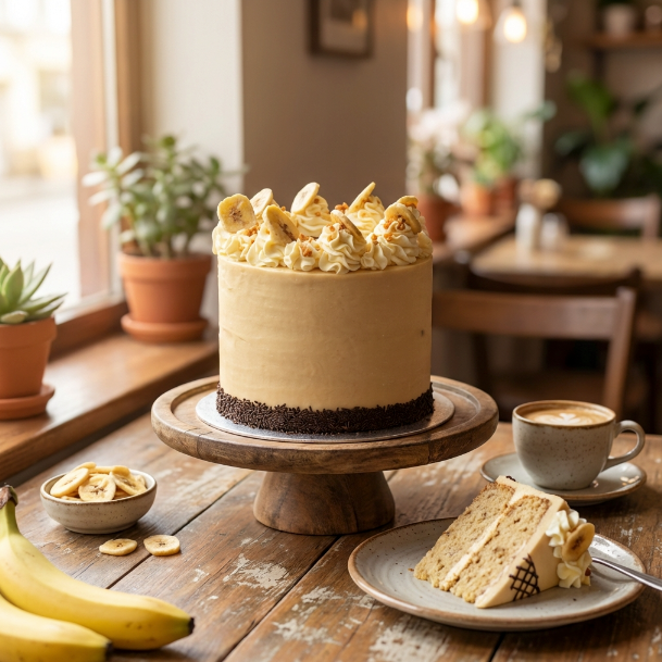 Our Banoffee cake is absolutely lovely. Banana cake with caramel buttercream filling and cover, toffee nibs and topped with banana chips read full description