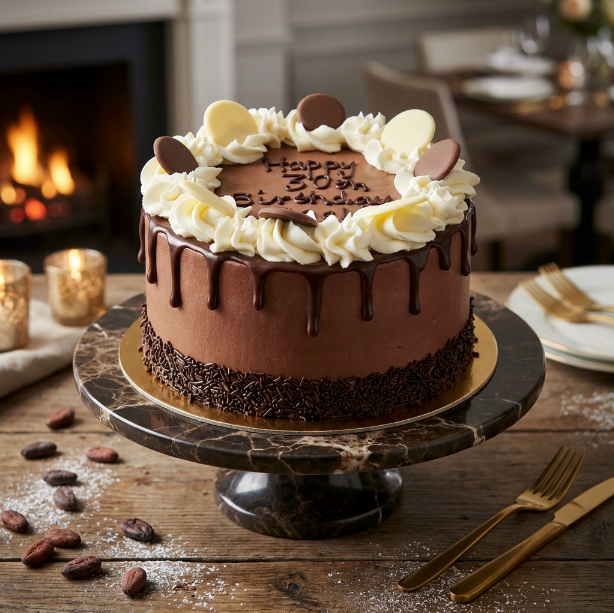 It is filled and covered with our smooth chocolate Italian Meringue Buttercream—a lighter, creamier alternative to standard icing that isn't too sweet. To finish, we add a dark chocolate drip, hand-piped rosettes, and a sprinkle of white and dark chocolate drops.