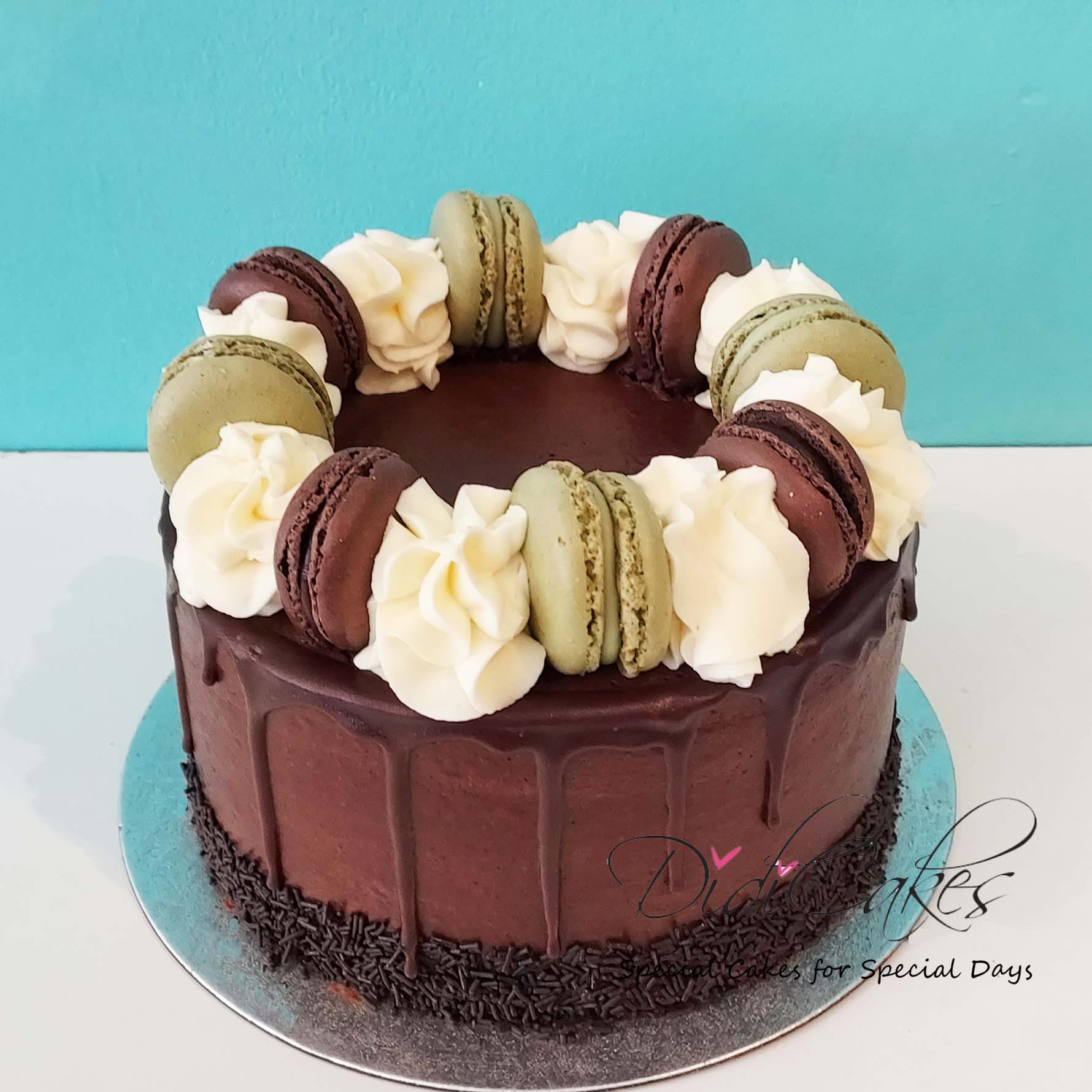 Our deliciously moist German chocolate cake filled and enrobed in lovely Italian meringue buttercream. Topped with a rosette and yummy chocolate and pistachio macaroons.