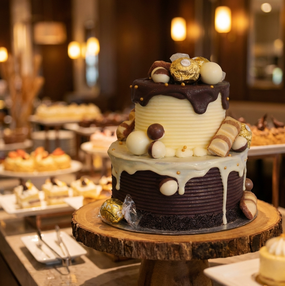 One tier based on our lovely moist chocolate sponge, complemented by a vanilla Italian Meringue buttercream with a reverse dark chocolate drip. The second tier a light vanilla sponge, covered in a chocolate Italian Meringue Buttercream with reverse colour white chocolate drip.