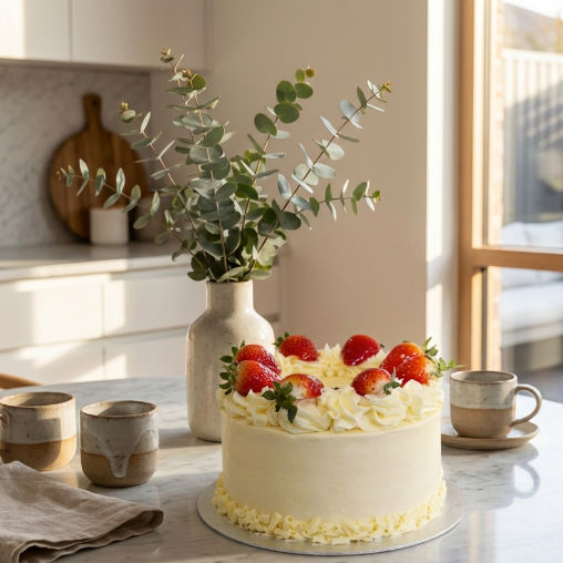 A rich and moist sponge, filled with strawberry conserve and rich Vegan Buttercream. Decorated with fresh hand selected glazed strawberries.