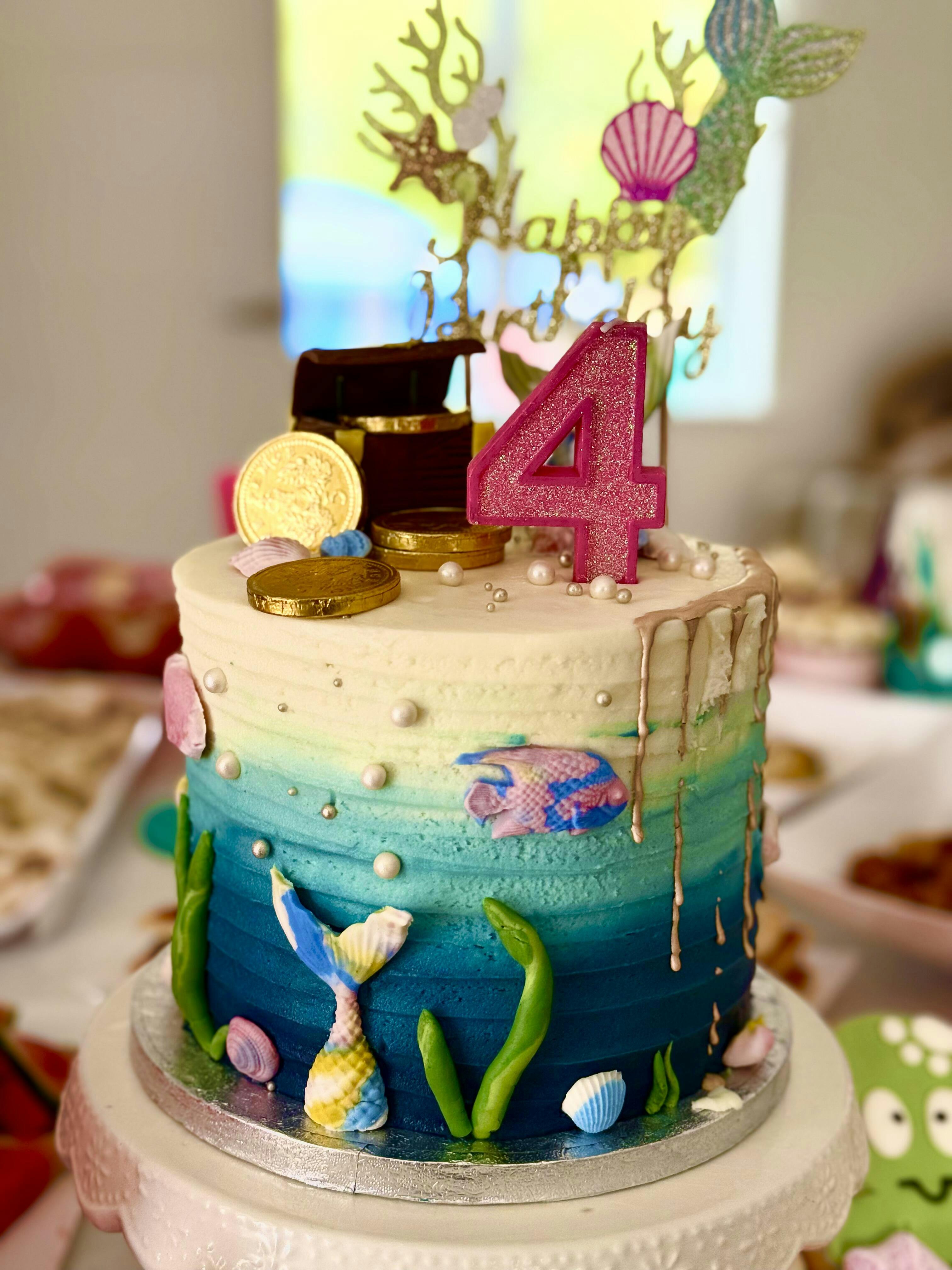 Aaaarh me hearties! Here's our Pirates and Mermaids cake, decorated with pirates treasure chest, mermaid tails, edible gems, pearls and chocolate coins.