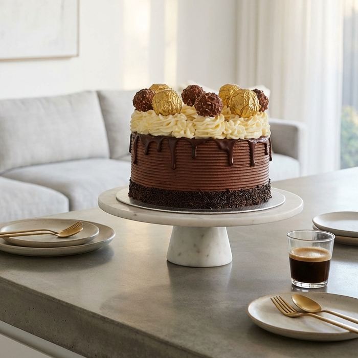 Each slice offers a symphony of rich flavours and luxurious textures. Discover a perfectly moist chocolate sponge, generously embraced by a silky smooth hazelnut Italian Meringue Buttercream. The experience is completed with a glossy dark chocolate drip, elegant piped rosettes, and beautifully placed chocolate and gold-wrapped Ferrero Rocher confectionery, making it a stunning centrepiece for any occasion.